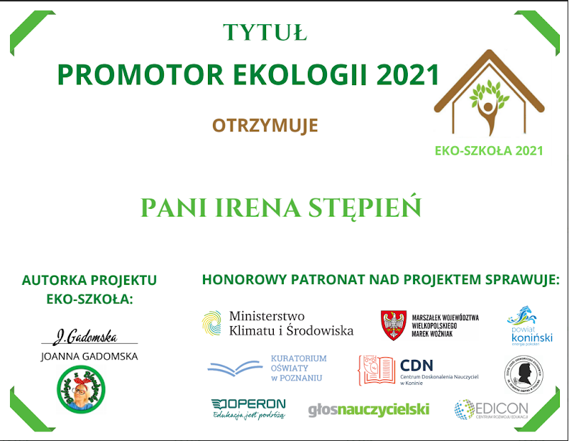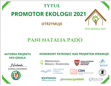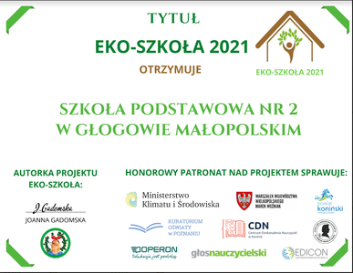 W roku szkolnym 2020/2021 nasza szkoła brała udział w ogólnopolskim projekcie Eko-Szkoła 2021. Ideą projektu jest promowanie postaw proekologicznych oraz pobudzanie uczniów do aktywnego działania na rzecz środowiska, dzięki udziałowi w akcjach, imprezach i innych działaniach proekologicznych, co daje im poczucie posiadania osobistego wpływu na zmiany w stanie środowiska. sprawozdanie_z_ekoszkoly.pdf