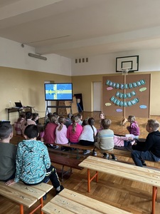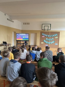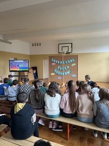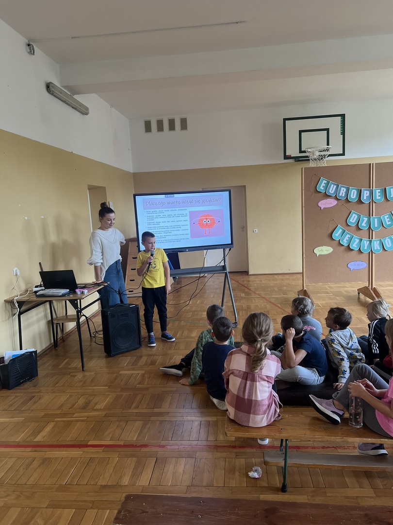 Następnie uczniowie zapoznani zostali z różnymi ciekawostkami na temat przeróżnych krajów i języków. Młodzież chętnie zgłaszała się do odpowiedzi i aktywnie uczestniczyła w prezentacji.