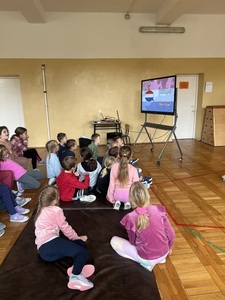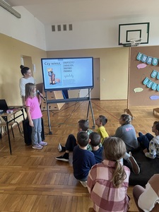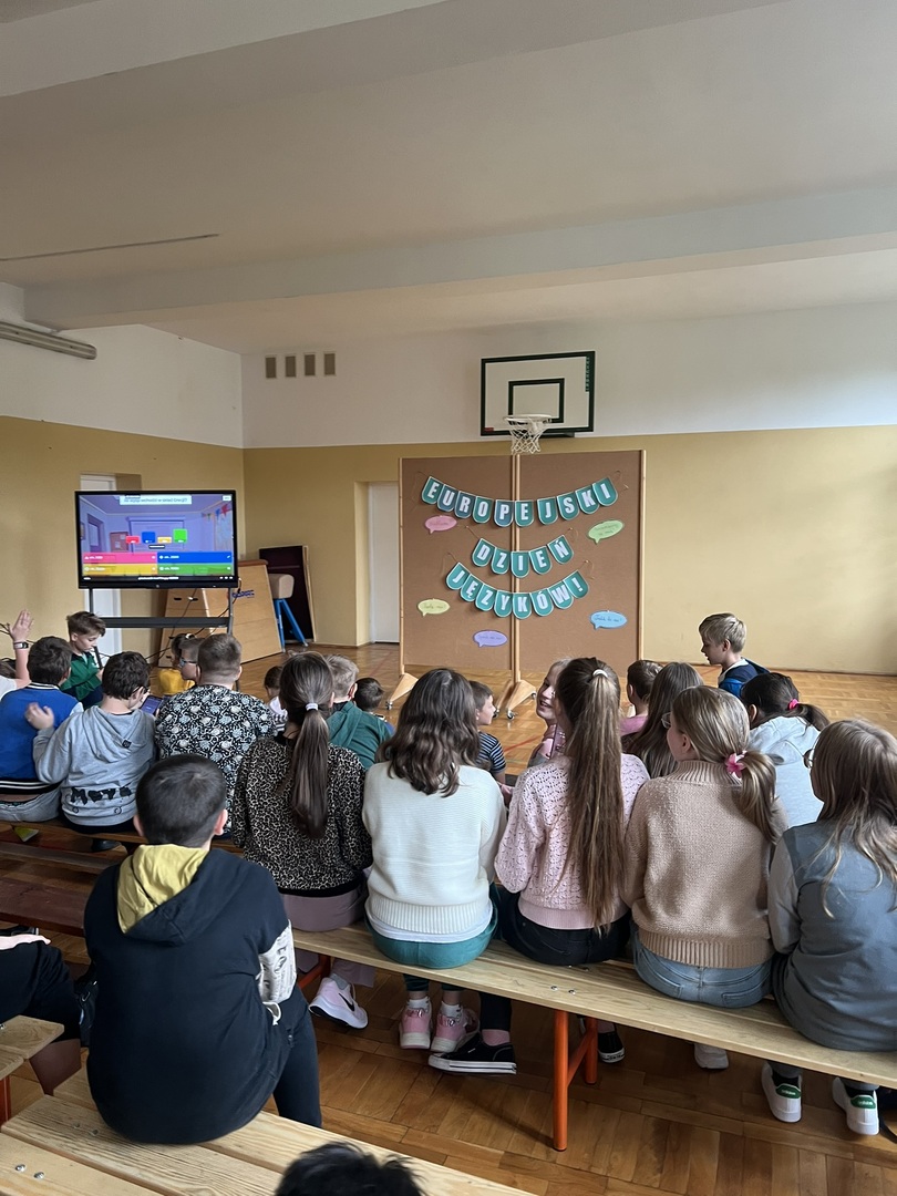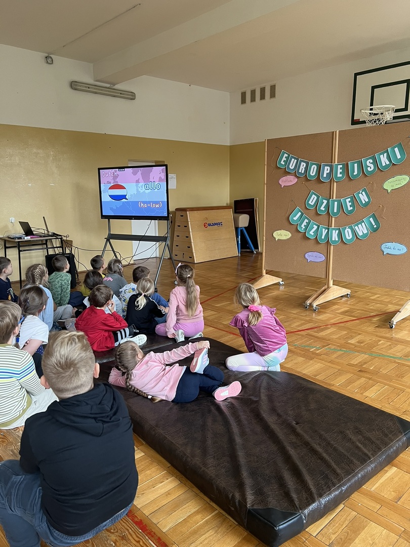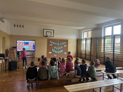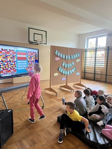 Młodsze dzieci z klas 1-3 wykonywały ćwiczenia na tablicy interaktywnej poprzez platformę Wordwall. Pojawiła się gra w memory, gdzie trzeba było znaleź pary takich samych flag. Najmłodsi zgadywali również jak wymawiać "Dziękuję" w innych językach oraz szukali w "morzu" liter powitania o obcym znaczeniu, w czym pomagało im nagranie wymowy tego wyrazu. I trochę Pani :)