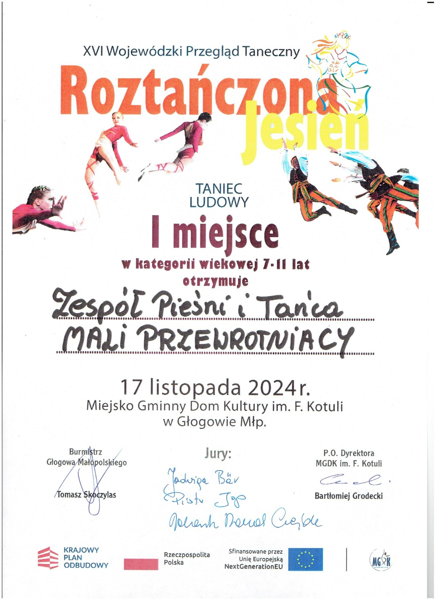 Miło nam poinformować, że uczennica naszej szkoły Klara Mackiewicz wraz z Zespołem Pieśni i Tańca MALI PRZEWROTNIACY zajęła I miejsce w XVI Wojewódzkim Przeglądzie Tanecznym "Roztańczona Jesień".