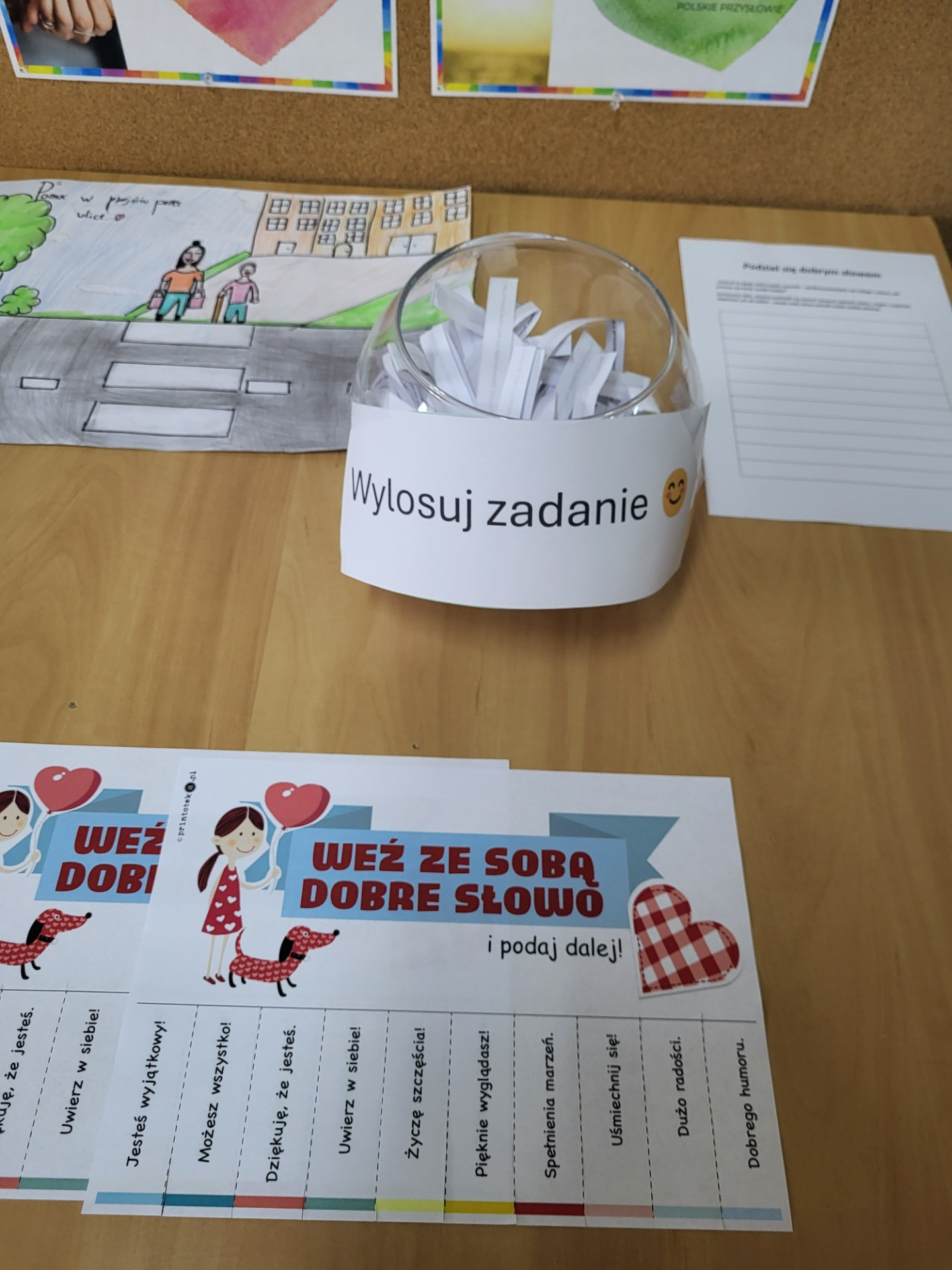 Tydzień Życzliwości w naszej szkole był wyjątkowym wydarzeniem, które miało na celu promowanie empatii, życzliwości i pozytywnych relacji między uczniami oraz nauczycielami. W ramach tego tygodnia przygotowano specjalną akcję, w której uczniowie mogli losować zadania związane z okazywaniem życzliwości. Każde zadanie miało na celu zachęcanie do prostych, ale znaczących gestów wobec innych.