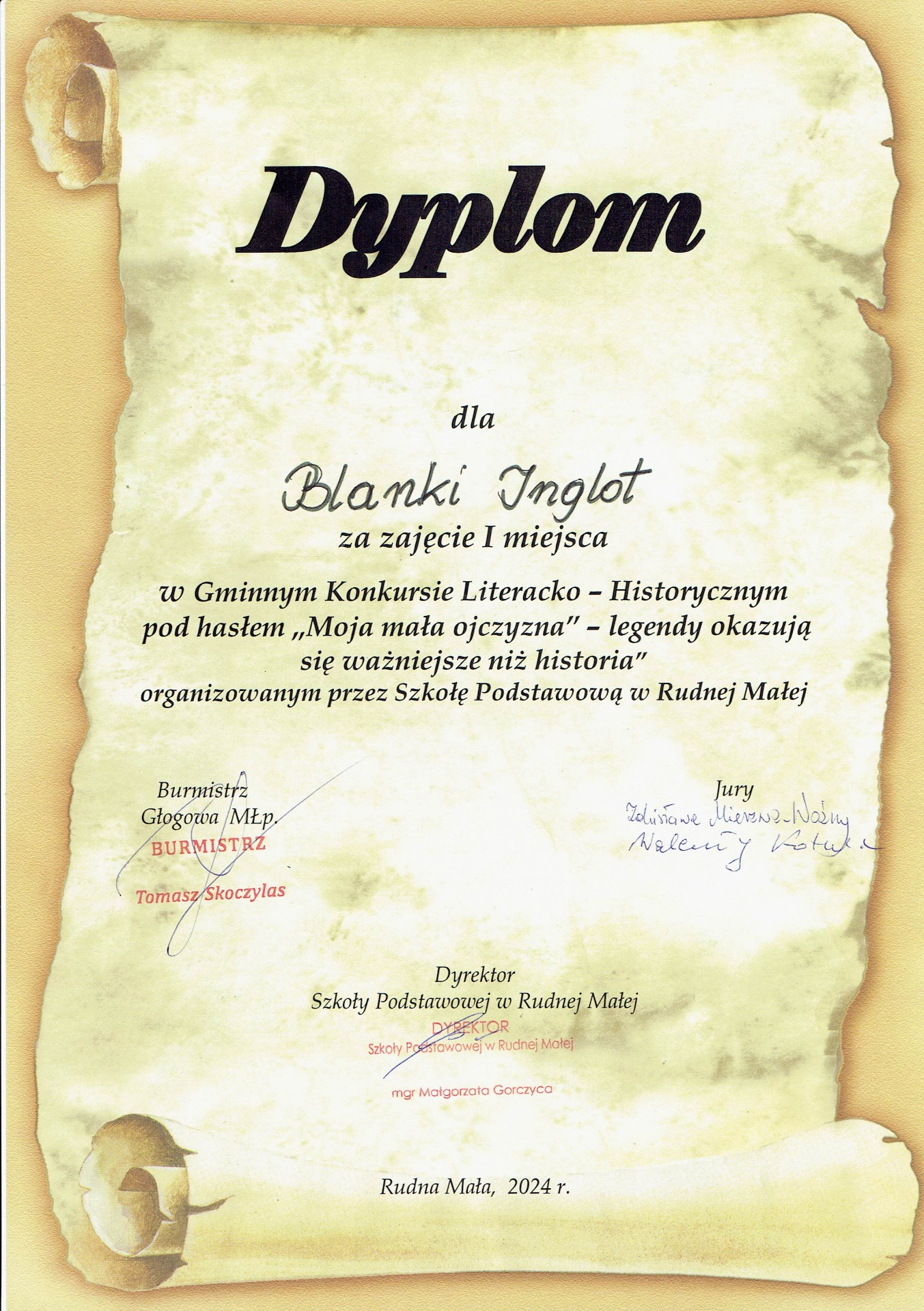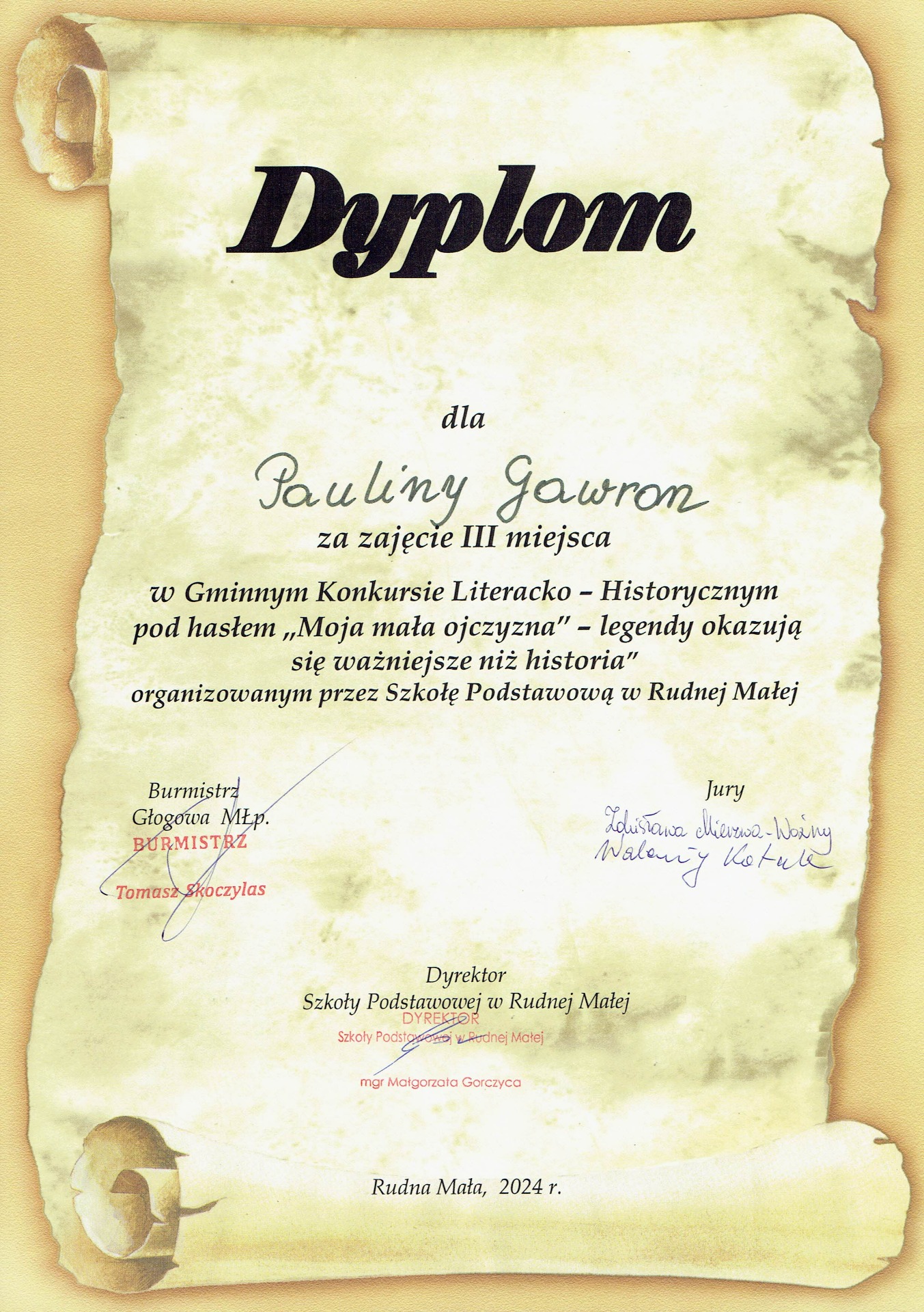 Miło nam poinformować, że prace uczennic klasy V zostały nagrodzone w Gminnym Konkursie Literacko-Historycznym pod hasłem "Moja mała ojczyzna-legendy okazują się ważniejsze niż historia". Blanka Inglot zajęła I miejsce, a Paulina Gawron III miejsce.