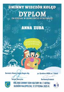 Dnia 12 stycznia 2025 r. w MGDK w Głogowie Małopolskim odbył się Gminny Wieczór Kolęd. W koncercie wzięli udział uczniowie naszej szkoły: Anna Zuba, Patryk Grygiel oraz Klara Mackiewicz wraz z Zespołem Pieśni i Tańca MALI PRZEWROTNIACY.