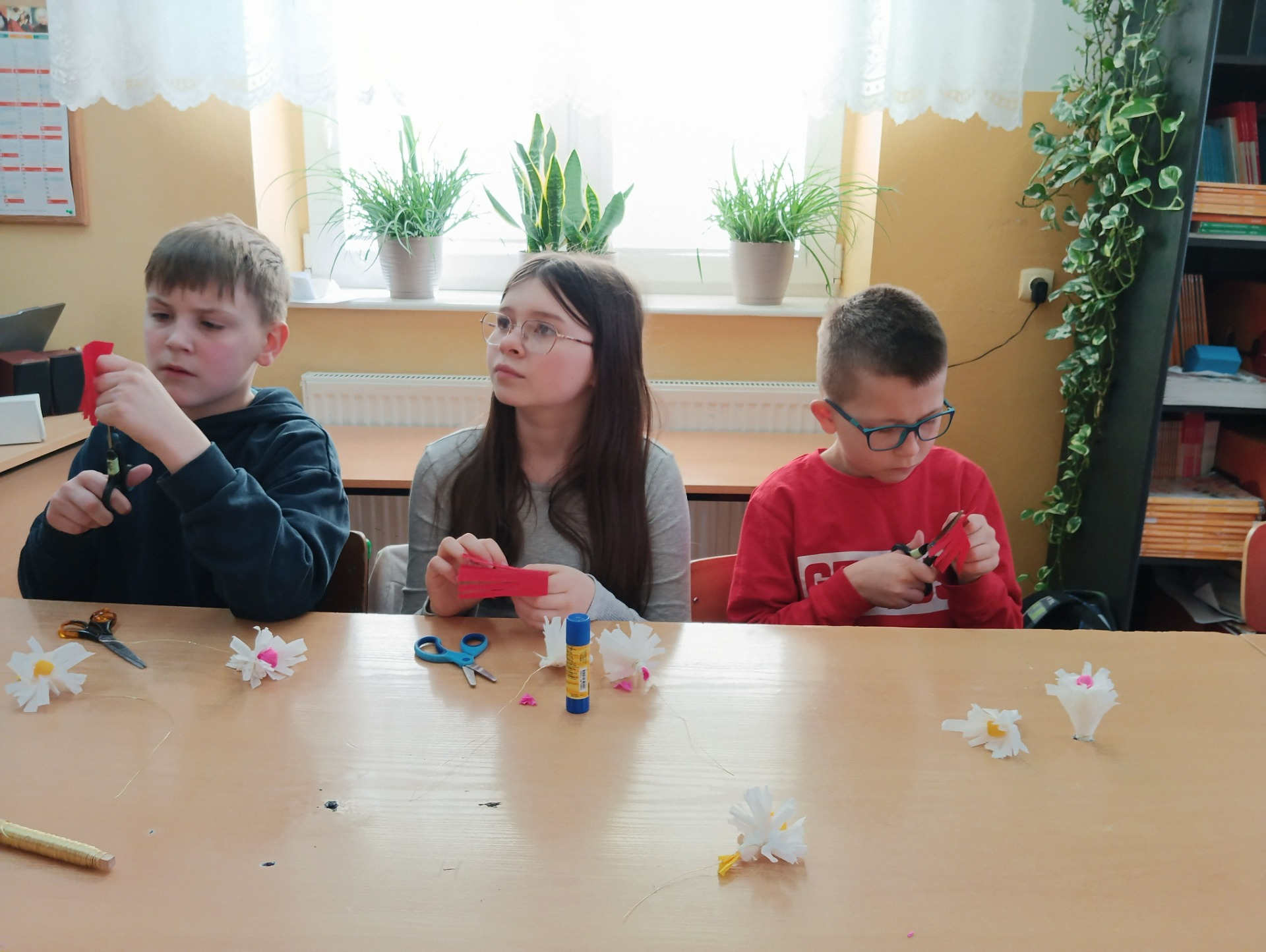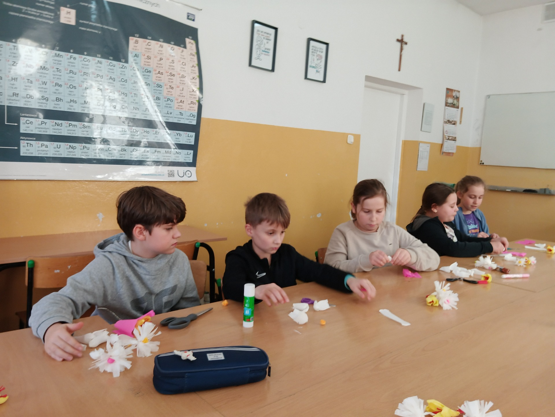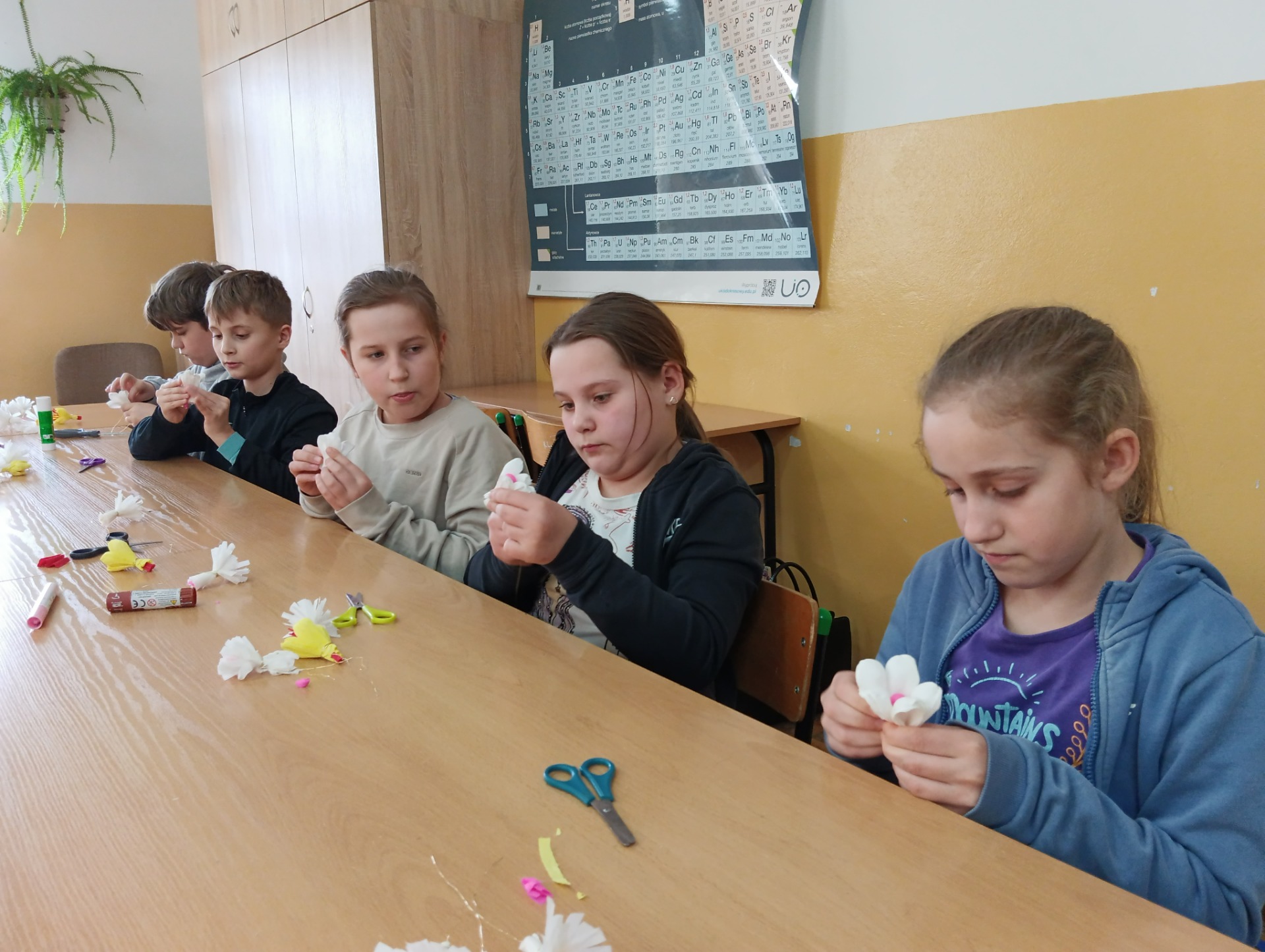 W dniu 17 marca 2025 r. uczniowie kl. IV i VI brali udział w warsztatach "Kwiaty z bibuły". Zajęcia prowadziła pani Paulina Szeliga z Miejsko Gminnego Domu Kultury im. Franciszka Kotuli w Głogowie Małopolskim. Uczestnicy warsztatów poznali etapy wykonania pięknych kwiatów. Wszyscy wykazali się inwencją twórczą i zaangażowaniem.