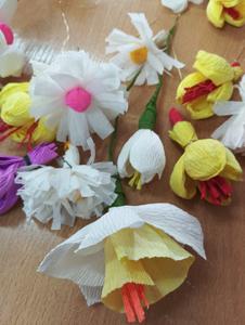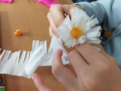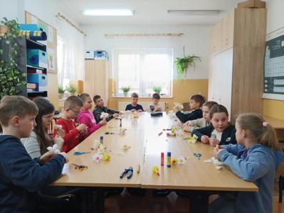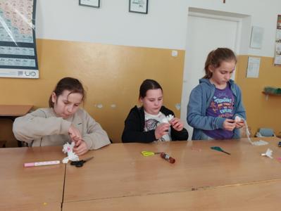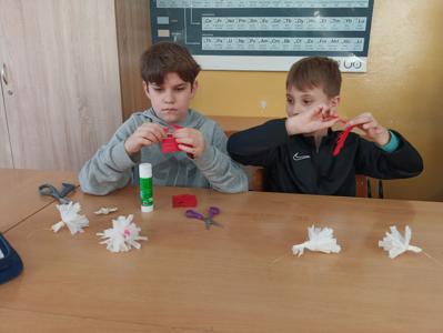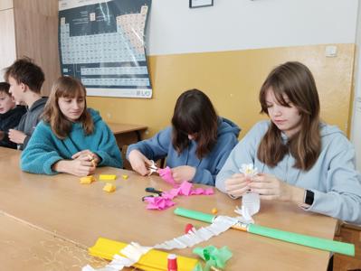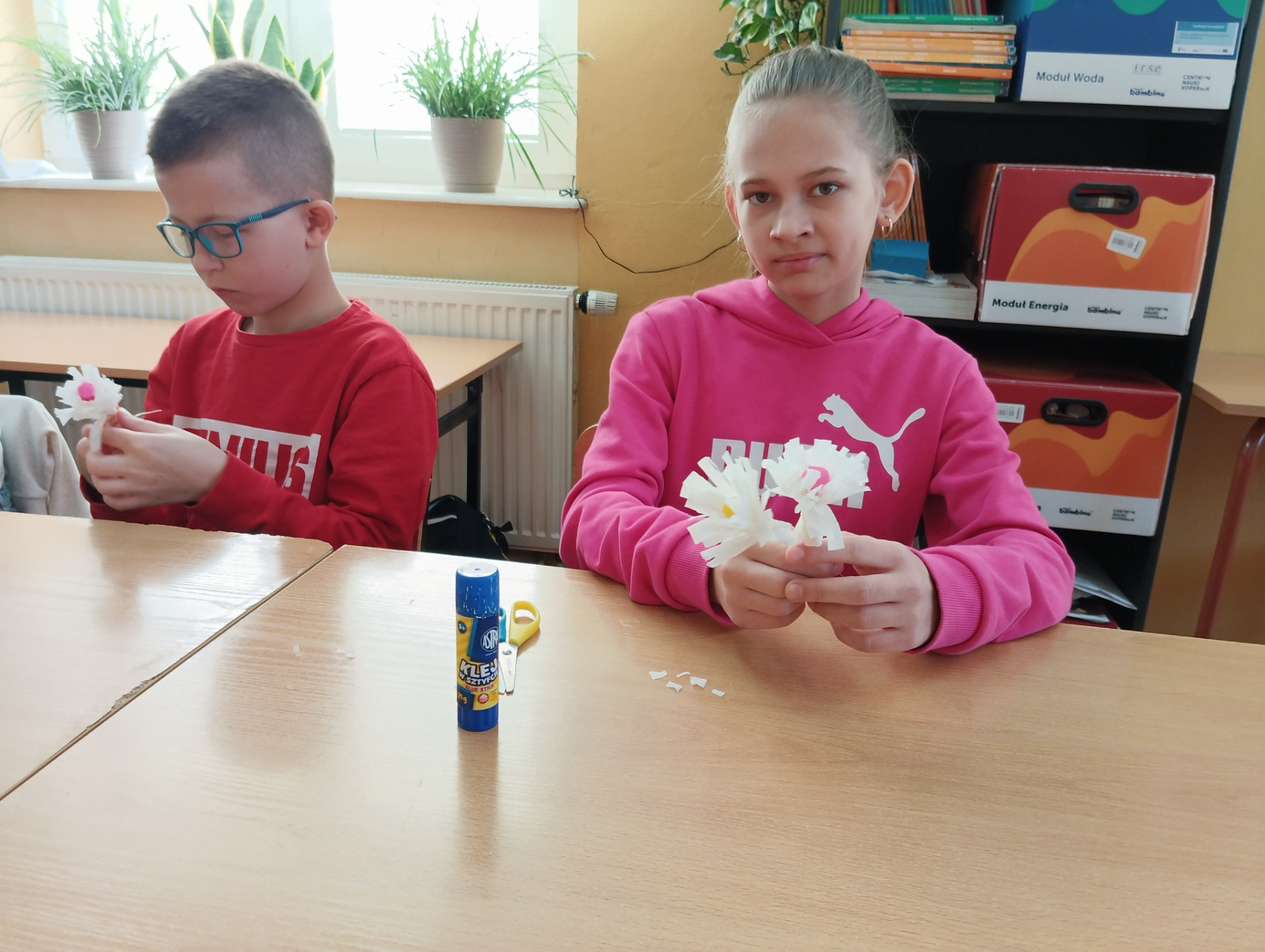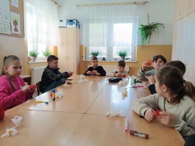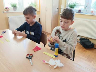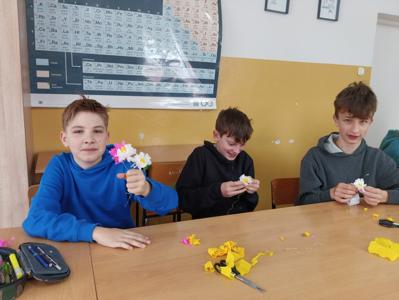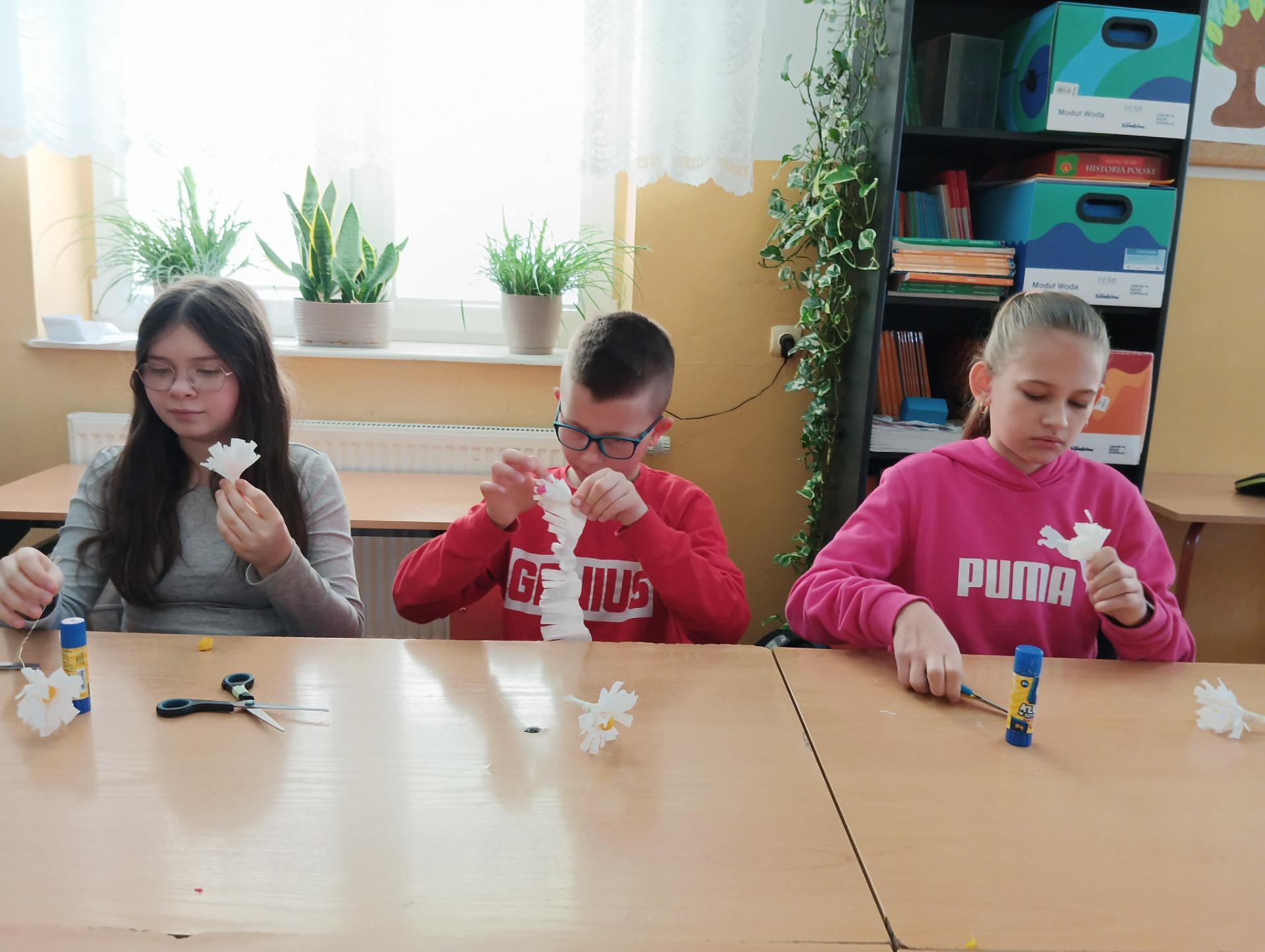 W dniu 17 marca 2025 r. uczniowie kl. IV i VI brali udział w warsztatach "Kwiaty z bibuły". Zajęcia prowadziła pani Paulina Szeliga z Miejsko Gminnego Domu Kultury im. Franciszka Kotuli w Głogowie Małopolskim. Uczestnicy warsztatów poznali etapy wykonania pięknych kwiatów. Wszyscy wykazali się inwencją twórczą i zaangażowaniem.