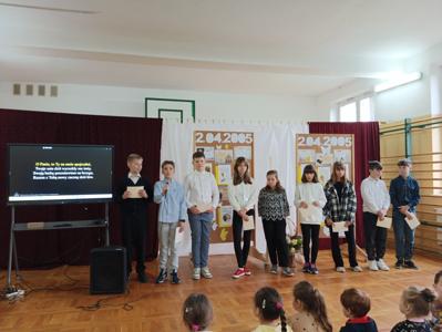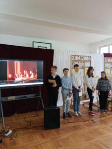 W ramach obchodów uczniowie klasy 6 przygotowali montaż słowno-muzyczny, który przeniósł nas w czasy pontyfikatu Papieża Polaka. Na zakończenie akademii została odśpiewana "Barka" -ulubiona pieśń Jana Pawła II. W tym szczególnym dniu nie zabrakło także symbolicznego gestu. Uczniowie mieli okazję spróbować kremówek papieskich, o których wspominał sam Ojciec Święty podczas wizyty w rodzinnym mieście - Wadowicach.